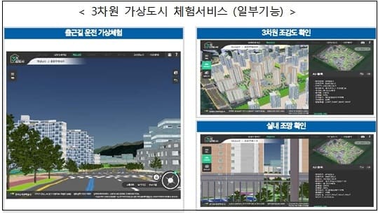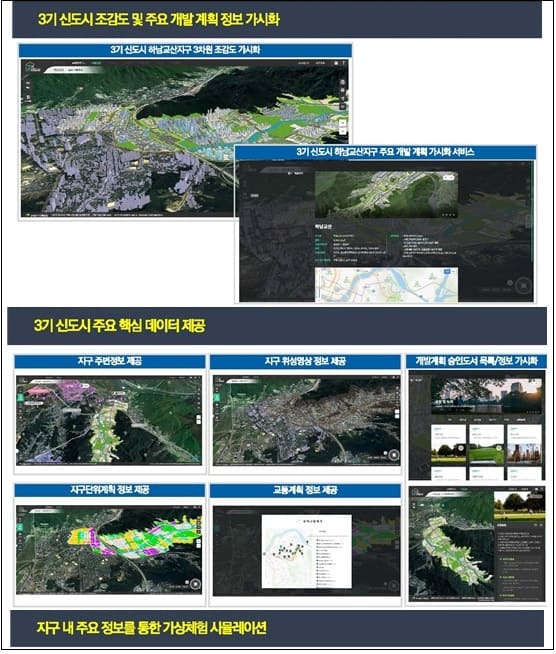또한, 도시의 정보를 3D로 변환해 입주 이후의 아파트 단지나 주변 건물을 입체적으로 파악할 수 있는 ‘3기 신도시 3차원 가상도시 체험서비스(https://dtinfo.lh.or.kr)’도 지난 ’21년부터 제공하고 있다.