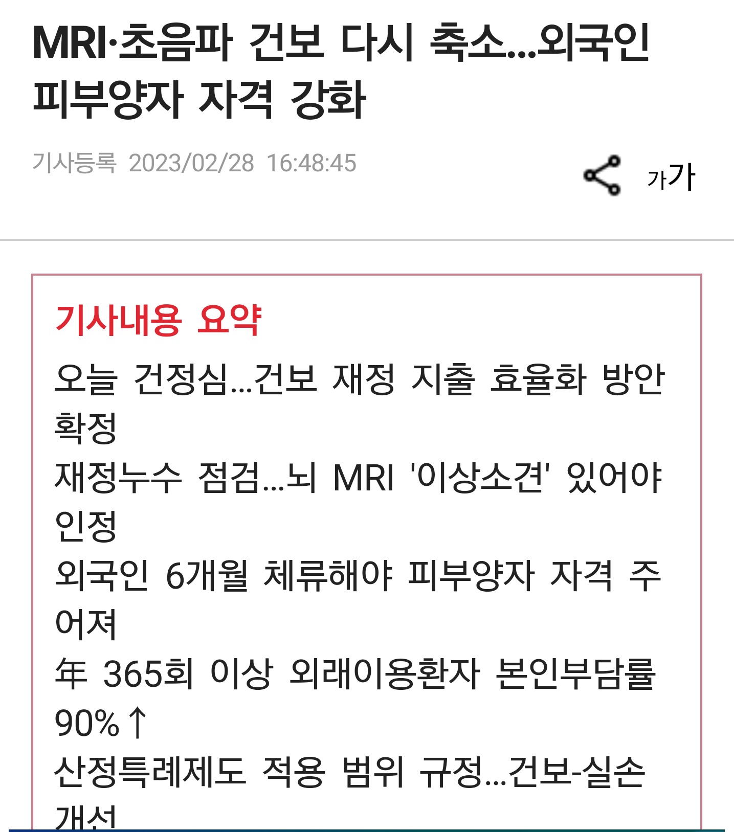 외국인이나 해외 장기체류자는 입국 후 6개월이 지나야 건보 혜택을 받을 수 있게 된다. 자기공명영상(MRI) 검사는 사전 신경학적 검사상 이상소견이 있는 경우에만 건보를 적용하고 그 횟수도 더욱 제한하기로 했다.