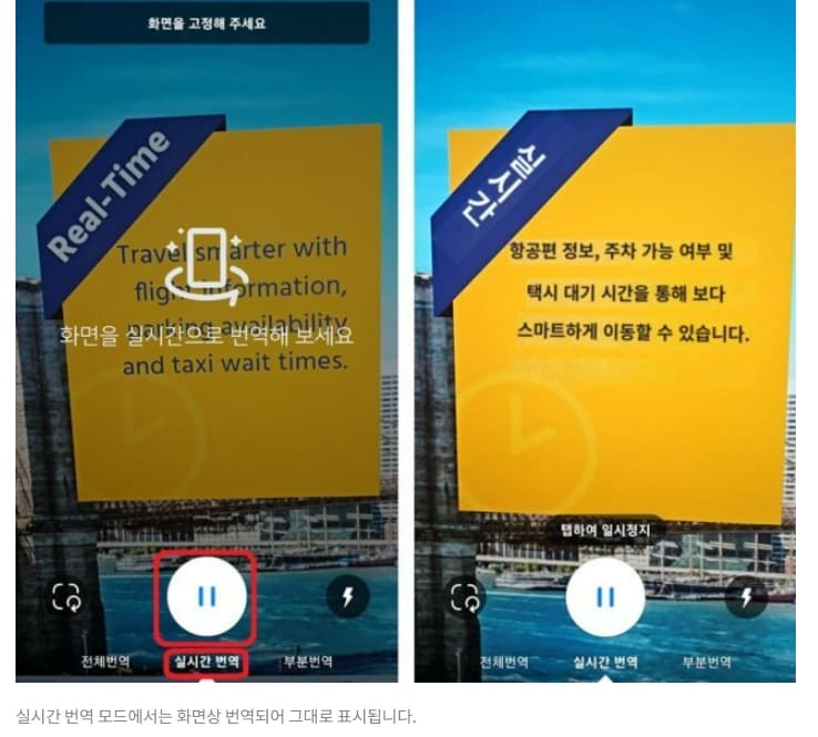 ‘실시간 번역’ 모드는 좀 더 직관적인데요. 카메라로 화면을 비추거나, 일시정지(II) 아이콘을 터치하면, 현재 화면의 모든 외국어가 번역되어 화면상에 그대로 표시됩니다. 상당히 유용하고 신기한 기능이지만, 번역에 몇 초 정도 시간이 걸립니다.