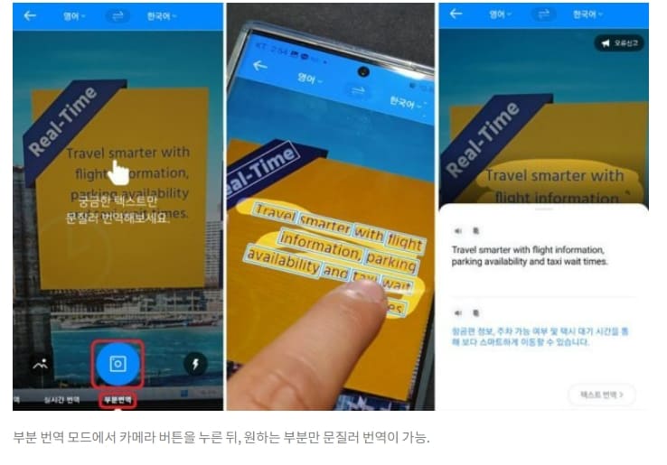 ‘부분 번역’ 모드는 전체 번역과 약간 다릅니다. 카메라 아이콘을 눌러 사진을 찍는 과정은 동일하지만, 화면 전체의 단어나 문장을 인식시키는 단계가 없습니다. 손가락으로 문지른 부분만 번역하게 되니, 원하는 단어나 문장만 즉시 번역하고 싶을 때 유용합니다.