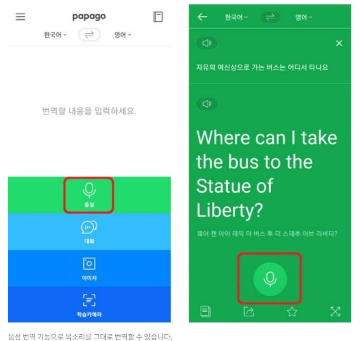미국 뉴욕의 JFK 공항에 도착한 후, ‘자유의 여신상’으로 가는 버스 편을 알아보려 미국인 안내원에게 질문하려 합니다. 초기 화면의 ‘음성’ 탭을 터치하면, 목소리를 입력하는 음성 입력 모드(녹색 화면)로 전환됩니다. 곧바로 한국어로 “자유의 여신상으로 가는 버스는 어디에서 타나요?”라고 말하면, 즉시 번역되어 “Where can I take the bus to the statue of liberty?”라는 영어 음성으로 출력됩니다.