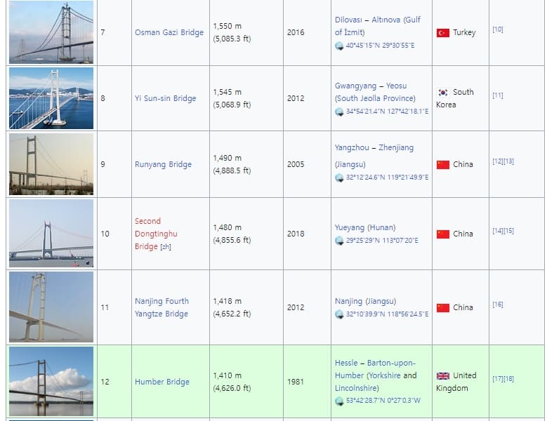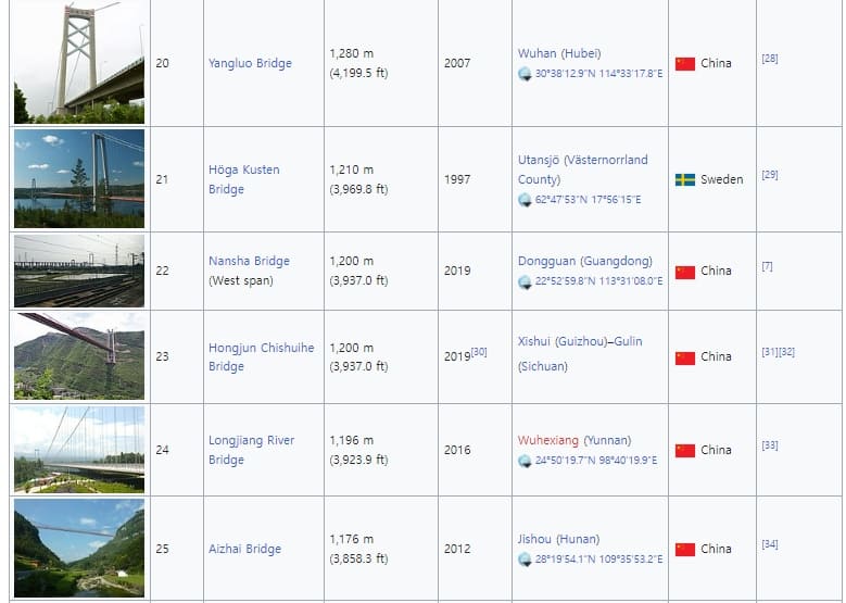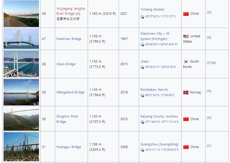 아래는 세계에서 가장 긴 주경간장을 가진 교량이다.