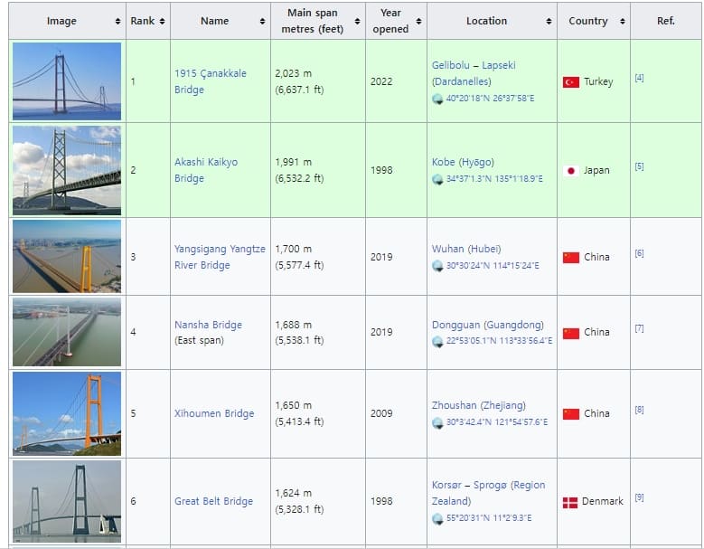 현재, 튀르키예의 1915년 차나칼레 다리는 2,023미터(6,637피트)의 길이로 2022년 3월에 개통된 이래로 기록을 보유하고 있다.1998년 이래로, 일본의 아카시 대교는 1,991 미터 (6,532 피트)의 길이로 이전에 기록을 보유했다.
