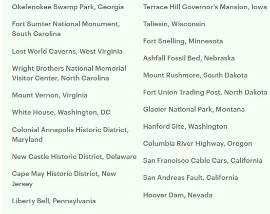 각 정류장은 모두 하위 48개 주에 있는 국립 자연 랜드마크, 국립 사적지, 국립 공원 또는 국립 기념물이다. 그 길은 총 50개의 상징적인 광경을 자랑한다.