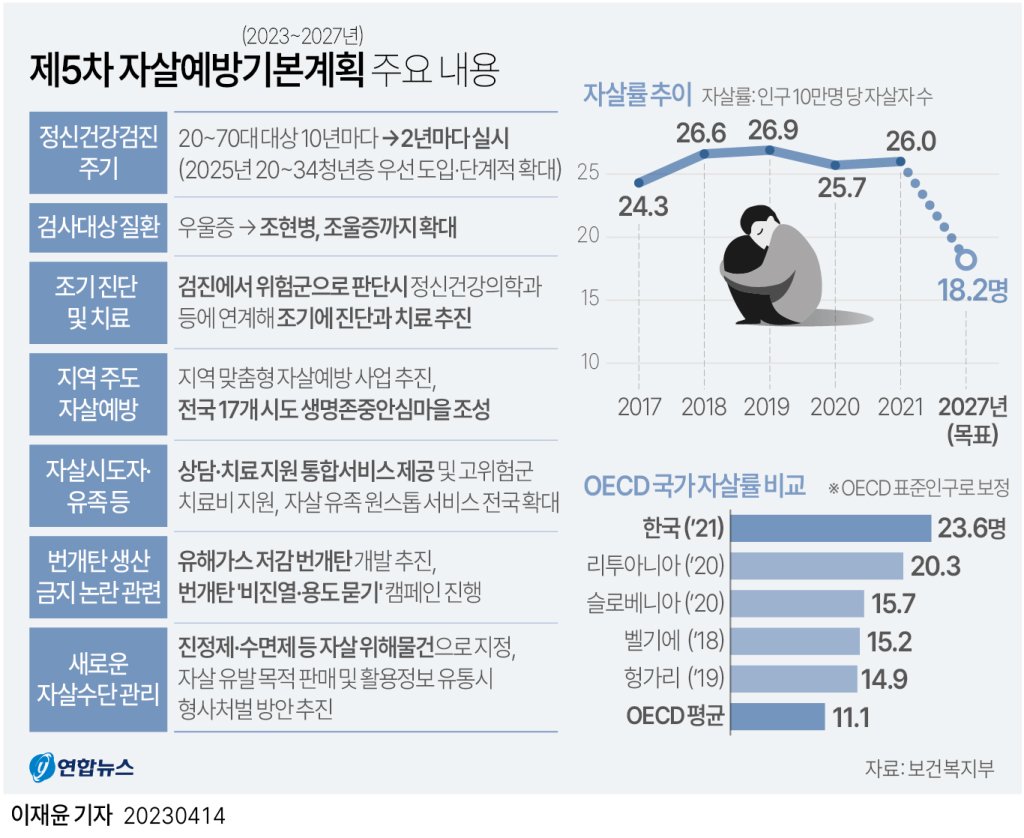 기본계획은 인구 10만명당 자살 사망자 수를 2021년 26.0명에서 2027년 18.2명으로 30% 줄이겠다는 목표를 내놨다.
