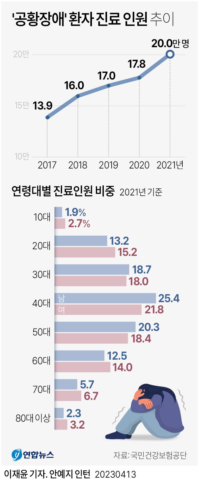 13일 국민건강보험공단이 건강보험 진료데이터를 활용해 '공황장애(질병코드 F41.0) 진료 현황을 살펴본 결과, 이 질병의 진료 인원은 2017년 13만8천736명에서 2021년 20만540명으로 44.5% 증가했다.