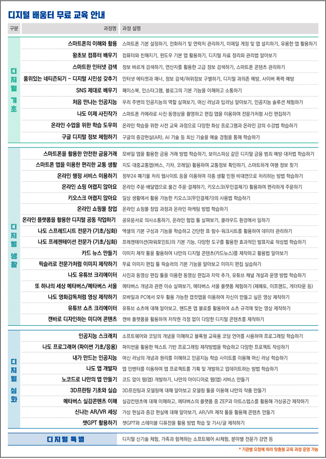 올해는 주민센터, 복지관, 생활유휴시설 등 지역 커뮤니티 기반의 디지털 배움터 135개소를 통해 디지털 기초부터 생활, 심화, 특별과정까지 98개 수준별 교육과정이 무료로 진행된다. 배움터마다 강사와 서포터즈를 2인 1조를 배치하여 챗GPT, 스마트폰, 키오스크 활용법, 교통앱 등을 교육하여 생활 속 디지털 역량을 높일 계획이며 올해는 시민 80,000명 교육을 목표로 하고 있다.