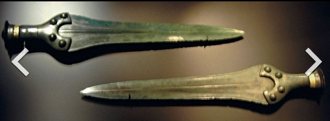 네브라스키 디스크와 함께 발견된 검들은 기원전 1600년경에 칼은 칼이나 단검에서 발전했다. 청동기시대(기원전 3000년경)에는 구리와 청동으로 만든 무기가 긴 잎 모양의 칼날과 손잡이 형태로 칼을 뻗은 자루 형태로 제작되었다. 칼은 칼의 절단면이 하나인 반면, 단검은 두 개의 절단면을 가지고 있다는 점에서 단검과 다르다.더 긴 날의 건설은 중동에서 기원전 3천년 동안 가능했는데, 처음에는 비소 구리, 그 다음에는 주석 청동으로 만들어졌다.