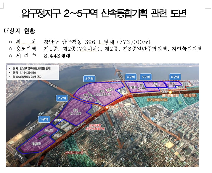 현재 압구정동에선 미성, 현대, 한양 등의 아파트 1만여 가구가 6개 구역으로 나뉘어 통합 재건축을 추진하고 있으며, 이 중 2~5구역이 신속통합기획에 참여했다.