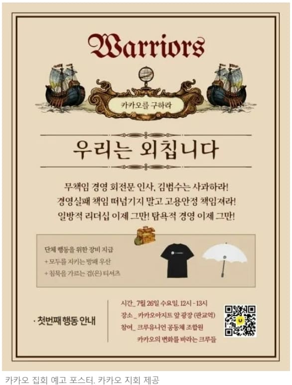 특히 카카오엔터프라이즈의 경영실패 책임이 큰 백상엽 대표의 재신임을 결정한 이사회와 대주주인 김범수 미래이니셔티브 센터장의 사과와 공동체로 확산중인 고용불안 해소를 요구할 예정이다.