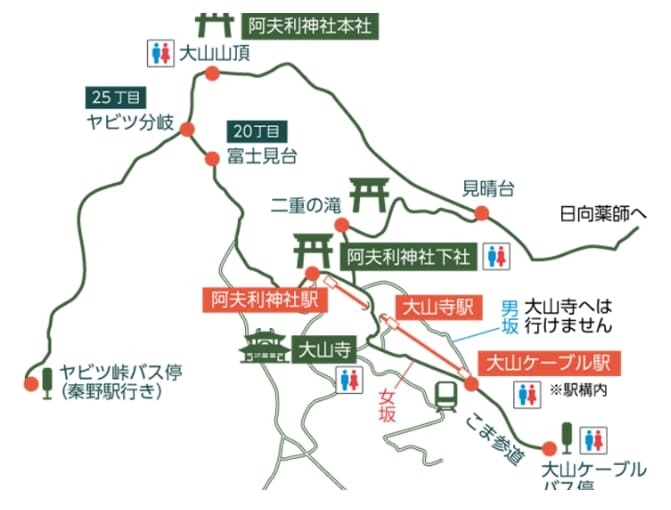 오야마는 화장실이 적은데 ‘오야마 케이블’ 버스정류장과 오야마 케이블역, 오야마데라, 아후리 신사 하사, 산정에만 있다. 아후리 신사 하사에서 산정까지 가는 길에는 매점도 없기 때문에 여름 철에는 여유있게 물을 챙겨 가자. 참고로 아후리 신사 하사에서 약수(고진수이)를 마시고 갈 수도 있다. 또 하사에는 찻집도 있으니 피곤하다 싶을 때에는 잠시 들러 휴식을 취해 보자.