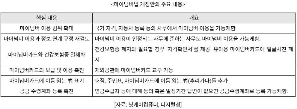마이넘버법의 개정안이 올해 6월에 성립됐다. 개정안에서는 마이넘버의 이용 범위 확대와 정보 연계를 원활하게 하는 등 마이넘버 제도를 더 쉽게 사용할 수 있도록 하고 있다.