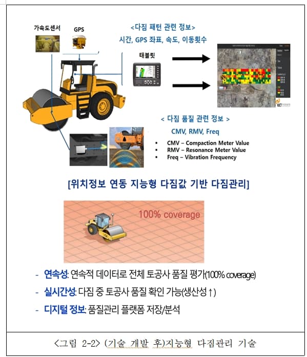 개발된 지능형 다짐 기술은 이러한 단점을 보완할 수 있다. 다짐 롤러에 부착된 센서 데이터를 해석하고 고정밀 GPS로부터 측정된 측위 데이터와 연계하여 실시간으로 품질 관리를 할 수 있다. 개발된 기술을 통해 전체 토공 품질관리 프로세스의 자동화 공정 수준을 높인 것이다.