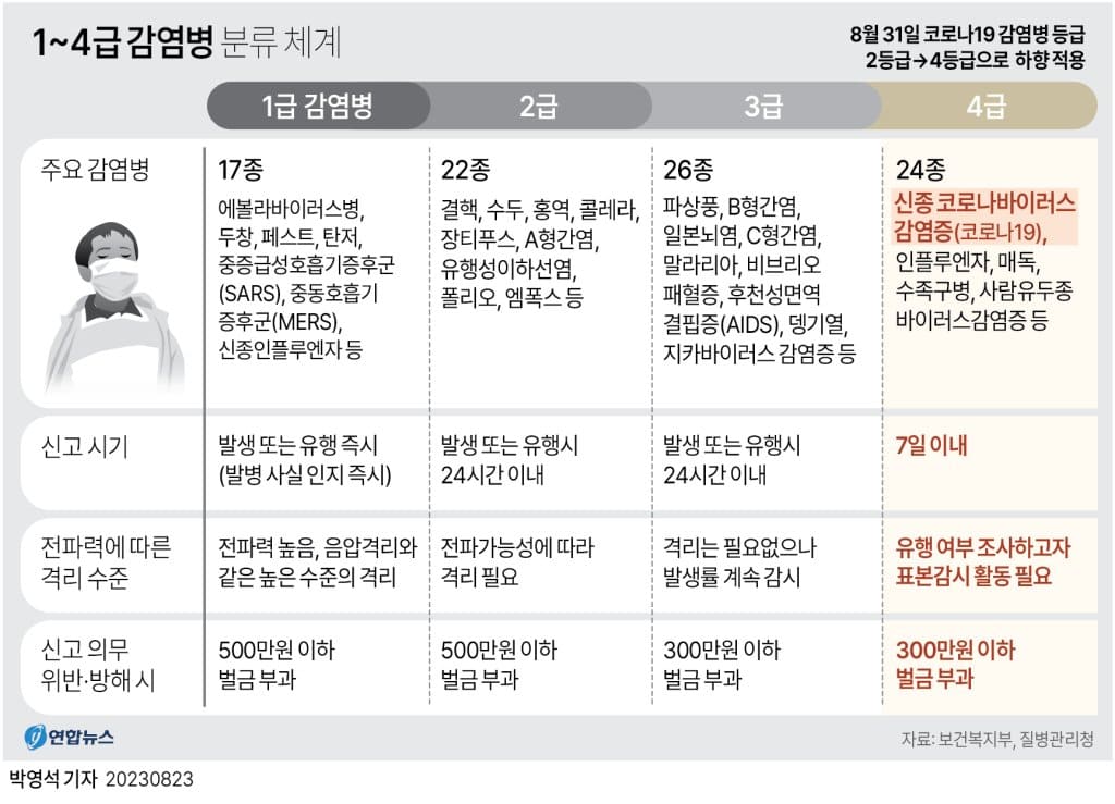 등급 하향과 함께 확진 검사와 입원 치료에 대한 비용 지원이 대폭 축소되고 확진자에 대한 생활지원비도 없어지는 등 지원책이 크게 줄어든다. 실내 마스크 착용 의무는 현행대로 유지된다.
