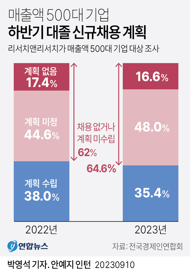 10일 전국경제인연합회(전경련)가 여론조사기관 리서치앤리서치에 의뢰해 매출액 500대 기업을 대상으로 ‘2023년 하반기 대졸 신규채용 계획’을 조사한 결과, 응답 기업(127사) 중 64.6%는 올해 하반기 신규채용 계획을 수립하지 못했거나 채용하지 않을 것이라고 답했다.