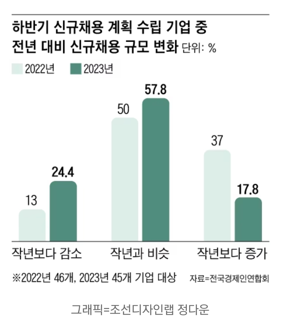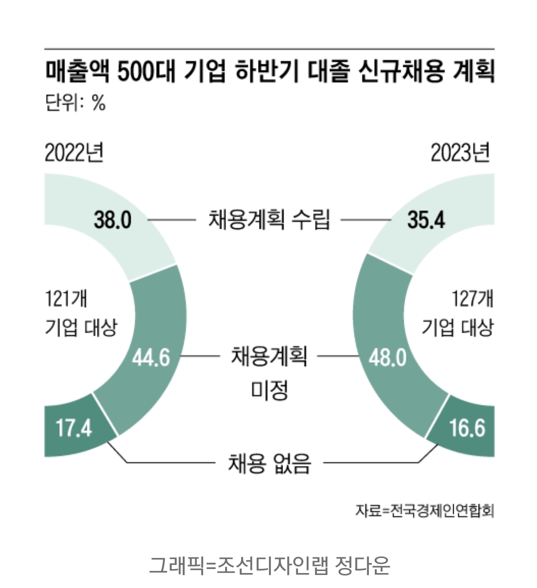 전국경제인연합회(전경련)는 여론조사기관 리서치앤리서치에 의뢰해 매출액 500대 기업을 대상으로 실시한 '2023년 하반기 대졸 신규 채용 계획' 조사 결과를 10일 발표했다.