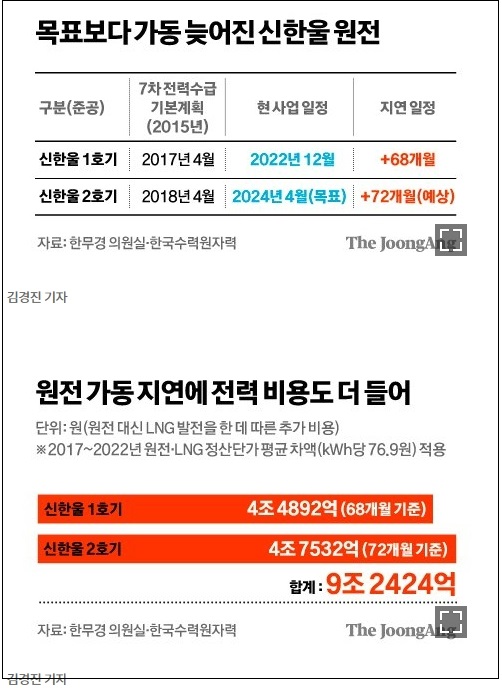 경북 울진의 신한울 1호기에 이어 2호기도 지난주 운영 허가를 받으면서 본격 가동에 다가섰다. 하지만 신한울 1·2호기 운영이 문재인 정부의 '탈원전' 여파로 5~6년 늦어진 탓에 이미 발생한 경제적 손실이 큰 것으로 나타났다. 원전 가동 대신 비싼 LNG(액화천연가스) 발전을 돌리면서 9조원 넘는 비용이 더 들어간 것으로 추정된다.