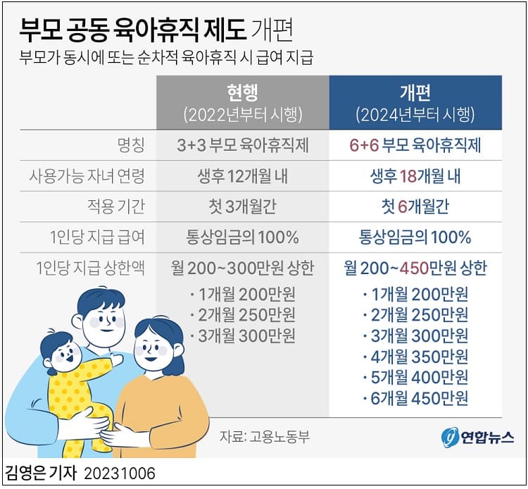 이에 정부는 ‘6+6 부모 육아휴직제’로 확대 개편해 특례를 적용받는 기간을 첫 3개월에서 첫 6개월로 늘리고, 자녀 연령도 생후 12개월 내에서 생후 18개월 내로 확대하기로 했다.