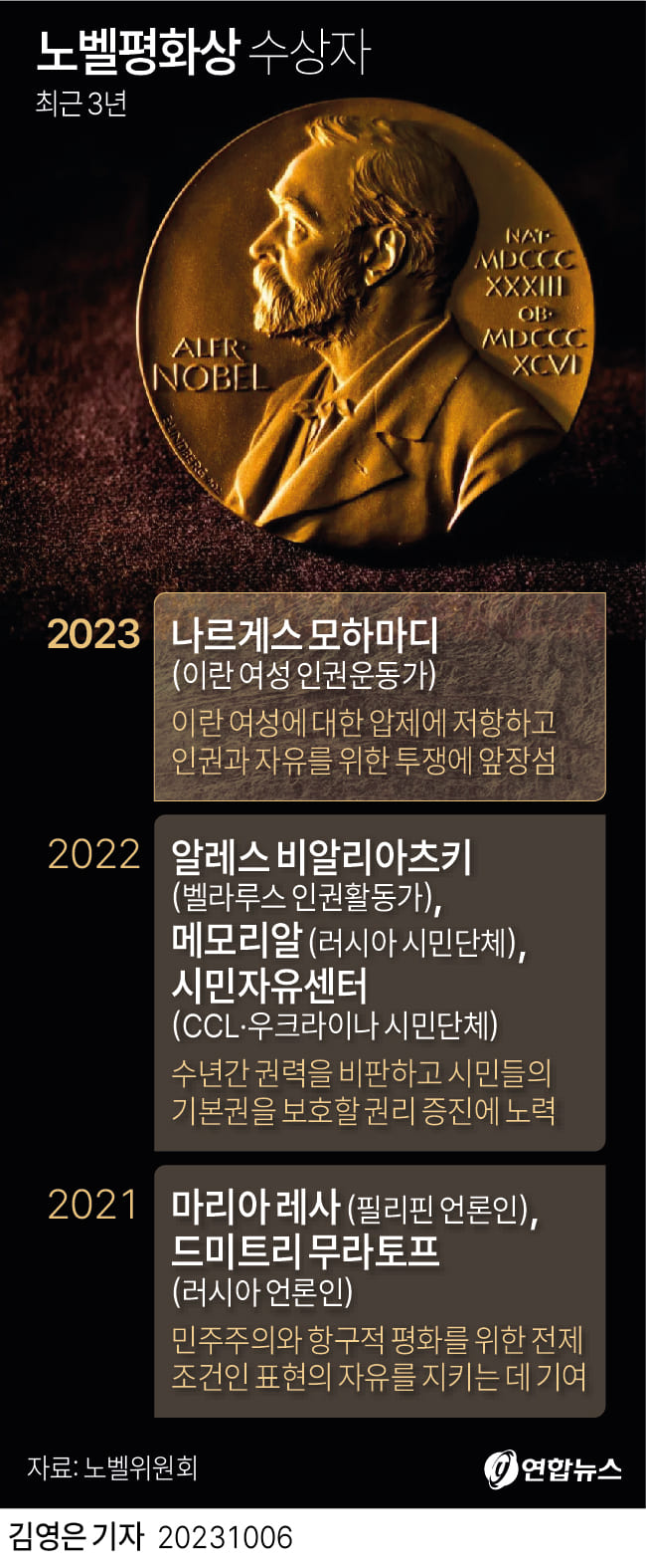 노르웨이 노벨위원회는 6일(현지시간) 모하마디가 이란 여성에 대한 압제에 저항하고 인권과 자유를 위한 투쟁에 앞장섰다며 노벨평화상 수상자로 선정했다고 발표했다.