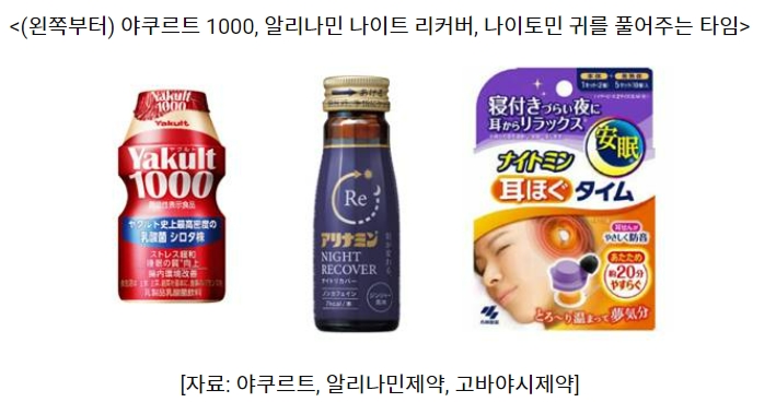그 외에도 2022년 히트상품 순위 15위에 오른 아리나민제약의 '아리나민 나이트 리커버'(판매가 192엔)는 수면 중 피로를 회복시켜 주는 음료로 누적 판매량 1250만 개를 돌파했다. 23위인 고바야시제약 '나이트민 귀를 풀어주는 타임'(판매가 730엔)은 귀를 따뜻하게 해 숙면을 유도하는 새로운 발상이 소비자들에게 호응을 얻으며 출시 1년 만에 146만 개 출하량을 달성했다.