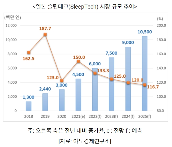 코로나 사태를 겪으며 다시 한번 건강과 'Well-Being'에 대한 관심이 높아진 가운데 수면에 돈을 쓰는 소비자들이 늘어나면서 수면 관련 상품에 대한 수요가 증가하고 있다. 이와 같은 수면(Sleep)과 기술(Technology)을 합친 '슬립테크(SleepTech)'가 일본 소비 트렌드 중 하나로 떠오르고 있다. 조사기관 야노경제연구소에 따르면, 일본 국내 슬립테크 시장은 2020년 30억 엔 규모에서 2025년 105억 엔 규모로 성장할 것으로 예측된다.