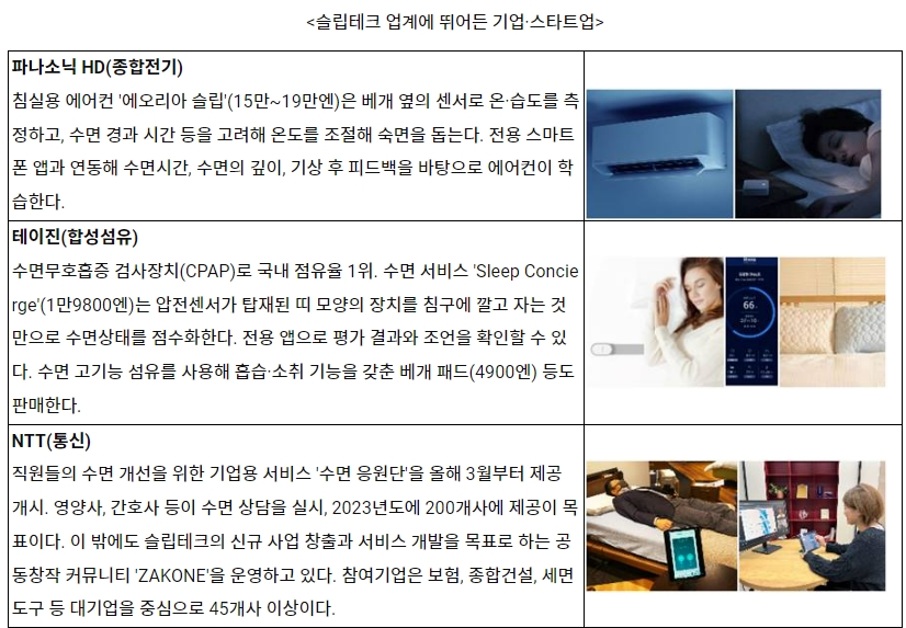 슬립테크의 잠재시장(침구신문사 조사)은 3조~5조 엔이라는 예측도 있으며, 다양한 하드웨어, 소프트웨어, 서비스, 여타 다양한 분야에서 비즈니스 기회를 잡기 위해 많은 기업이 진입을 시도하고 있다. 아래는 <일본 수면 비즈니스 맵>이다. 수면 비즈니스라 하면 '취침 중'에 필요한 베개, 이불의 침구류를 떠올리기 쉽지만 '취침 전' 하루의 피로를 풀어주는 아이템, '아침' 시간에 잠에서 깨어날 수 있도록 도와주는 제품이나 서비스, '낮'의 활동적인 시간에 도움이 되는 리커버리(Recovery) 웨어나 영양제 등도 있다는 것을 잊지 말아야 한다. 여기에 수면무호흡증(SAS), 수면장애, 불면증 등 수면 관련 질환에 대한 검사 및 치료(약물, CPAP 등)까지 포함하면 수면 비즈니스의 시장 규모는 더욱 커진다.