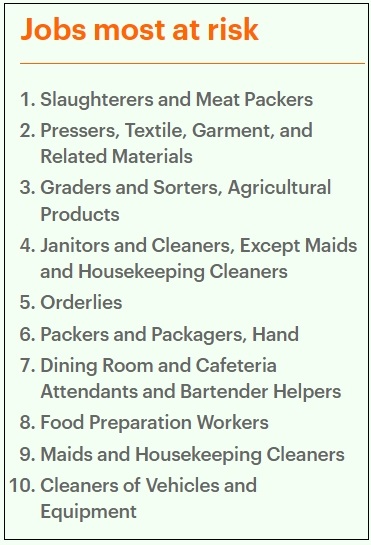전문가들에 따르면 육류 포장업자, 청소업자, 건설업자들은 멀지 않은 미래에 기계에 의해 쫓겨날 수 있는 사람들 중 하나이며 교사, 간호사, 패션 디자이너들은 현재 안전하다.