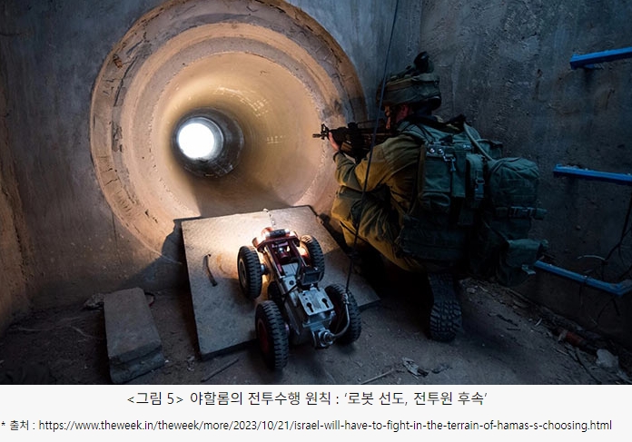 이스라엘군의 특수작전부대들도 美 육군과 유사하게 드론이나 로봇 등 무인체계를 운용하고 있다. 건물지역에서 운용되는 특수작전부대는 주야간 모두 드론의 감시·정찰로 전장을 가시화한 후 차후 행동을 이어나간다. 때에 따라서는 자폭드론을 운용하여 상대의 지휘통제를 일시적으로 마비시킨 후 핀셋작전에 돌입한다. 지하전투에 최적화되어 있는 야할롬(Yahalom)도 이와 같은 전투수행방법을 따르고 있다. 하지만 야할롬은 주로 지하에서 임무를 수행하여 감시·정찰, 지뢰제거, 오염물질 경고 등을 위한 로봇들이 추가적으로 편성되어 있다. 야할롬의 훈련 영상을 보면 ‘로봇 선도, 전투원 후속’의 원칙을 철저히 따르고 있다. 이것은 앞서 美 육군의 사례에서 언급했듯이 전투원의 생존성을 강화하면서, 동시에 전투 효율성을 극대화하기 위한 조치이다.
