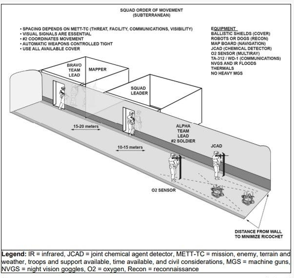 둘째, 유·무인 복합전투체계. 이것은 전투원과 무인체계의 유기적인 협업(Manned & Unmanned Teaming)을 의미하는 것인데, 그 목적은 전투원의 생존성을 강화하고 시간과 공간의 제한을 극본하여 전투 효율성을 극대화하는 것이다. 美 육군이 발간한 Subterranean Operations을 보면 보병분대 9명의 전투원과 2대의 소형 로봇이 결합된 분대급 유·무인 복합전투체계가 중점적으로 제시되어 있다. 이것은 협소하고 복잡한 지하 공간의 특성을 고려한 것이다. 이와 같은 분대급 유·무인 복합전투체계에서 소형 로봇 2대를 눈여겨봐야 할 필요가 있다.