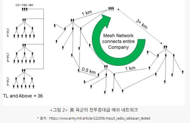 첫째, 메쉬(Mesh) 네트워크 기반 통신체계. 이것은 지하에 전개된 모든 전투원이 노드가 되어 릴레이 방식으로 무전이 가능하게 네트워크를 형성한다. 전파의 직진성이 제한되는 복잡하고 폐쇄된 지하공간에 최적화된 통신체계인 것이다. 美 육군은 이런 지하전투의 도전(Challenge)을 극복하기 위해 메쉬 네트워크 방식의 MPU5 무전기를 전력화하여 운용 중이다.