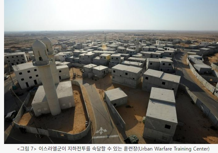 이스라엘군도 2011년 지하전투 훈련을 수행할 수 있는 훈련센터(Urban Warfare Training Center)를 개소했다. 제2차 레바논 전쟁(2006년)의 교훈을 반영한 결과였다. 당시 헤즈볼라가 각종 무기를 은·엄폐할 수 있는 지하진지들을 구축했고, 이것들을 지하터널로 연결한 후 기습적인 측·후방 공격을 실시하여 이스라엘군에게 적지 않은 피해를 입혔기 때문이다. 이 훈련센터에는 하마스의 준동에 대비하기 위한 ‘미니가자’도 포함되어 있다. 이스라엘군 특수작전부대들은 가자지구에서 상황이 발생할 경우 이곳 ‘미니가자’에서 예행연습을 실시한 후 실전에 투입되고 있다.