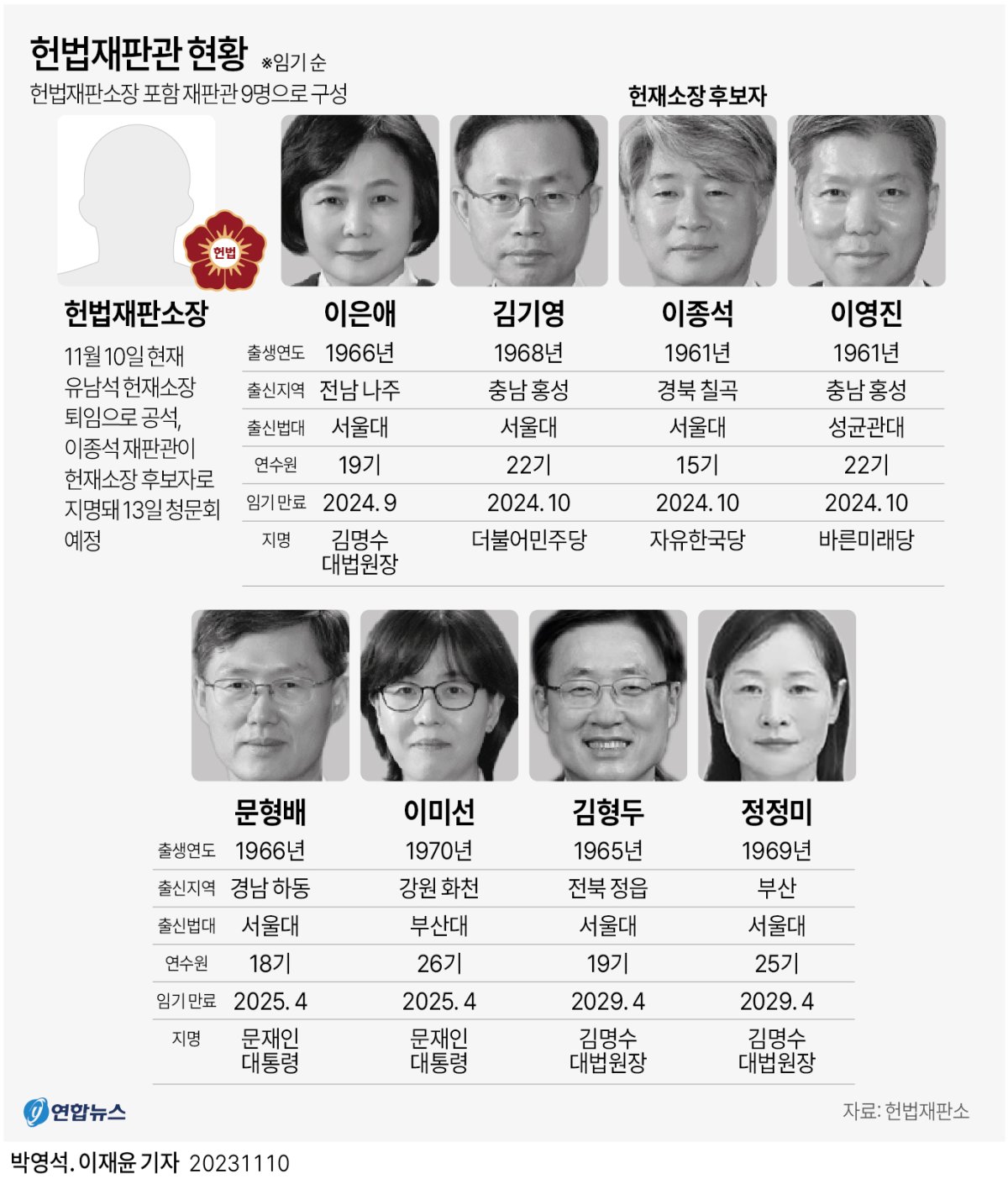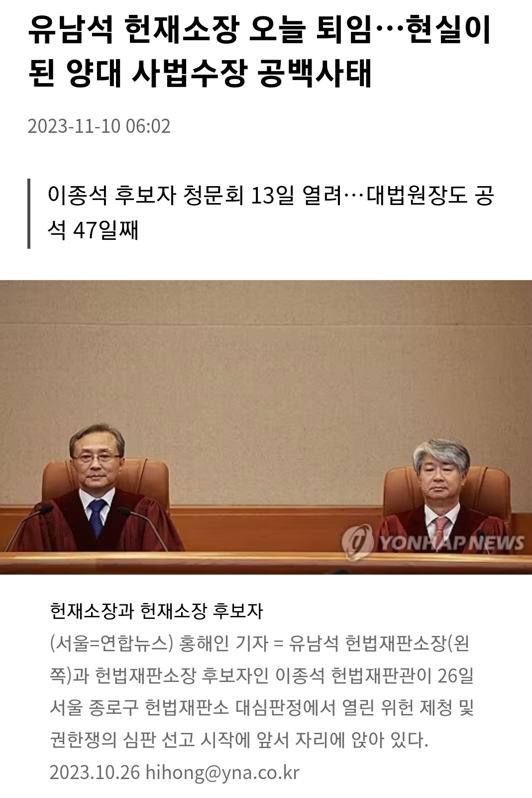 이에 윤석열 대통령은 유 소장의 후임자로 이종석 재판관을 지난달 18일 지명했다. 같은 달 25일 국회 인사청문특별위원회에 임명동의안이 회부됐으나 청문회는 이달 13일에나 열리게 되며 양대 최고 사법기관인 대법원과 헌재의 수장 자리가 동시에 공석이 됐다.