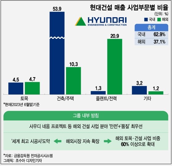 현대건설 (35,100원 0.00%)이 현재 37% 수준인 해외 건설사업 비중을 60% 이상으로 끌어올리기로 내부방침을 정했다. 사우디 네옴프로젝트 등 현대건설이 수주한 해외 현장을 교두보 삼아 '세계 최고 시공사'로 도약한다는 목표다.