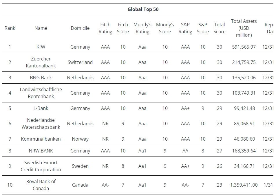 주목할 만한 변화로는 UBS가 크레디트 스위스를 인수한 후 11계단 하락한 48위를 기록한 것이 있습니다. 카이세 데포테트 위탁은 피치의 강등으로 한 계단 하락했고, 도이치 아포테커 앤드 에어로츠방크는 무디스가 등급을 철회한 덕분에 17계단 하락한 52위를 기록했습니다. 다른 회사들은 더 행복한 등급 결과를 누렸습니다. SFIL은 무디스의 등급 상향으로 혜택을 받아 지난해 등급에서 6계단 상승했습니다.