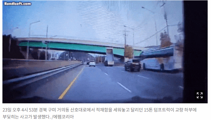23일 구미 소방서 등에 따르면, 이날 오후 4시53분 “금오공대에서 옥계 방면으로 향하던 화물차가 굴다리에 걸렸다”는 신고가 119에 접수됐다. 15톤 덤프트럭이 적재함을 열어놓고 달리다 교량 하부에 부딪히면서 사고가 발생한 것이다.