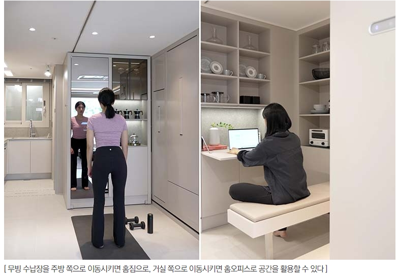 무빙 수납장을 주방 쪽으로 이동시키면 홈짐으로, 거실 쪽으로 이동시키면 홈오피스로 공간을 활용할 수 있다.
