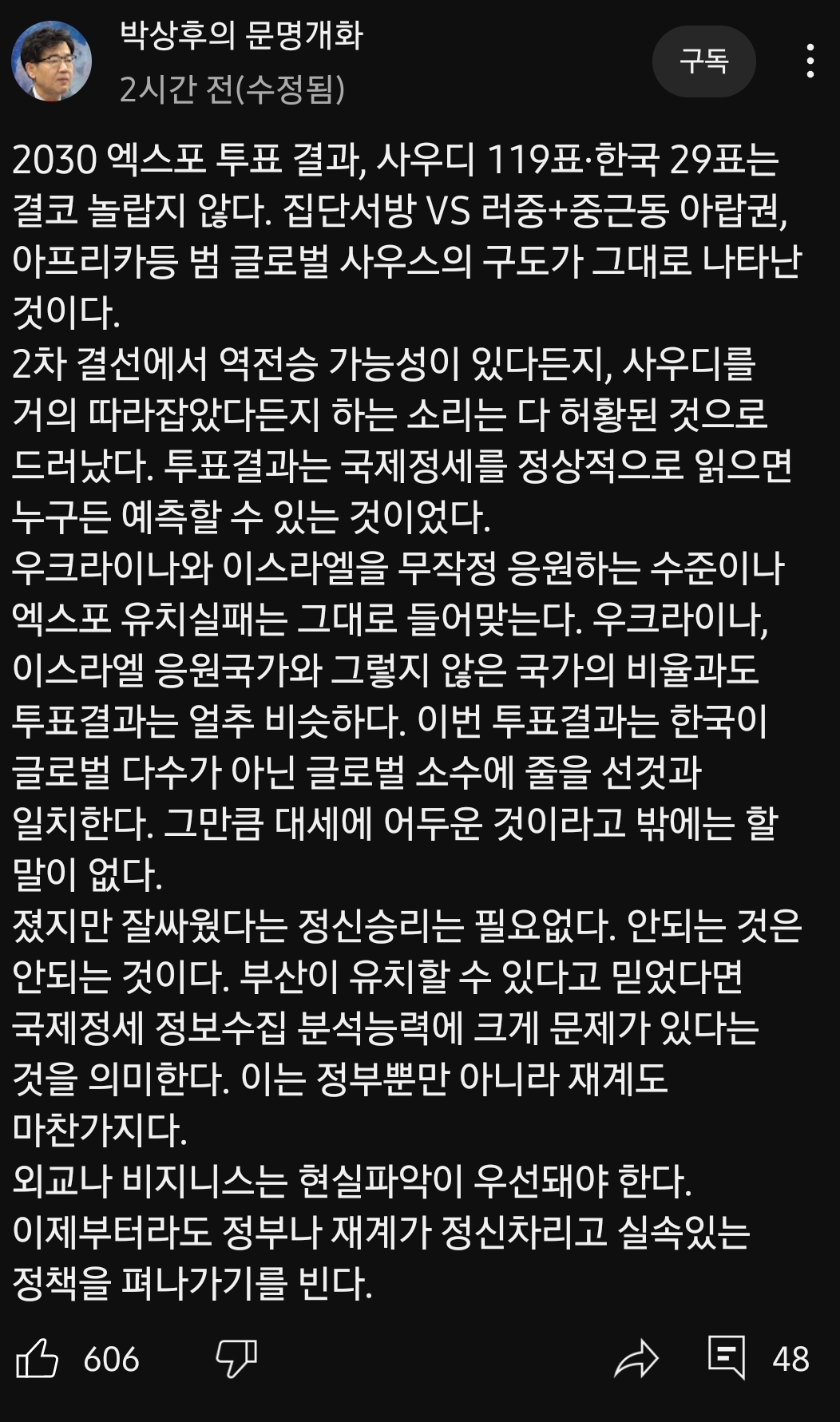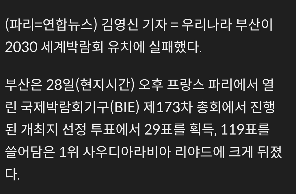 참패로 끝난 2030 엑스포 유치에 대한 환상: 119:29
