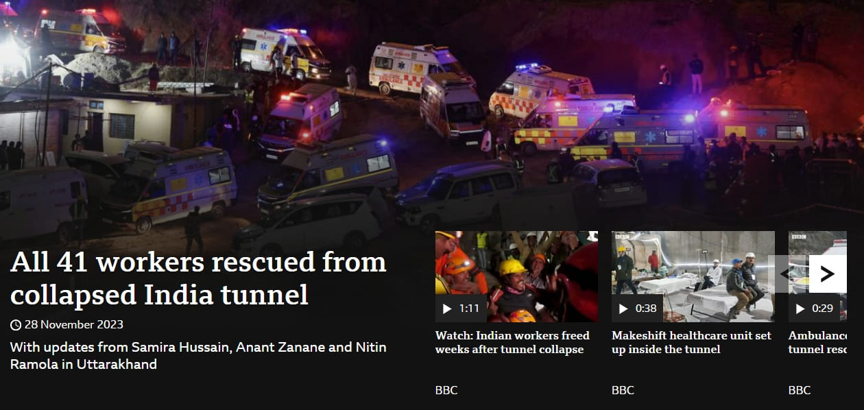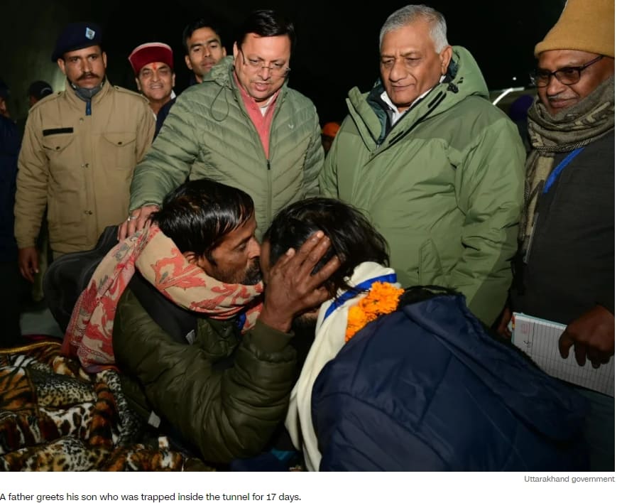 지난 12일(현지시간) 인도 북부 히말라야산맥 지역에서 공사 중이던 터널이 붕괴해 갇힌 인부 41명이 16일 만에 모두 구조됐다.