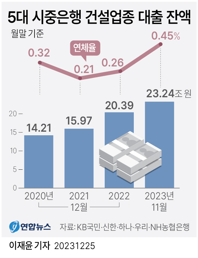 5대 시중은행 건설업 대출 잔액...2년 사이에 46% 급증...연체 규모 2배 증가