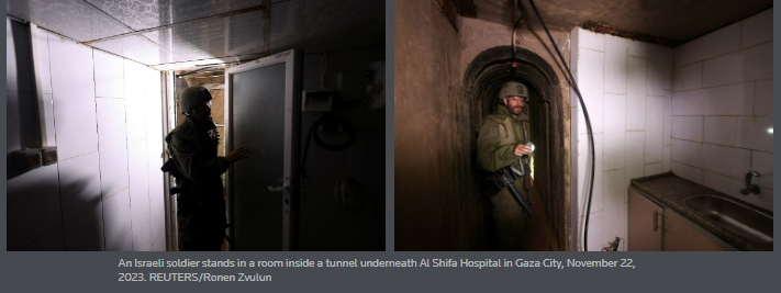 11월 22일, 이스라엘군은 일부 언론사들에게 가자시의 알 시파 병원 근처에 있는 콘크리트 줄로 된 터널을 보여주었는데, 이 터널은 하마스 전사들의 지휘소였다고 이스라엘군은 밝혔다. IDF가 지하 약 10미터 깊이에 있다고 밝힌 이 터널 단지는 침실, 타일로 된 화장실, 부엌 그리고 회의실이 특징이었다.