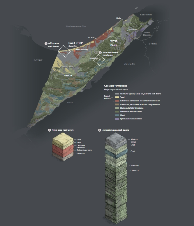 가자지구에서 흔히 볼 수 있는 모래나 양토의 형태는 하마스가 터널을 쉽게 굴착할 수 있게 해주었으며 이스라엘이 터널을 파괴하는 것도 어렵게 해주었다고 두 전문가는 말했다.