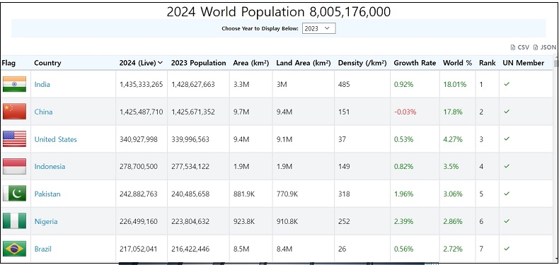 인도는 세계 1위 국가로 연 인구증가률이 1%에 가깝다.