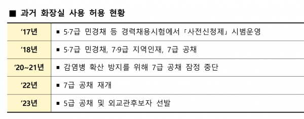그동안 단계적으로 확대해 왔던 화장실 사용을 올해부터는 전 국가공무원 선발시험에서 전면 허용하게 된다.