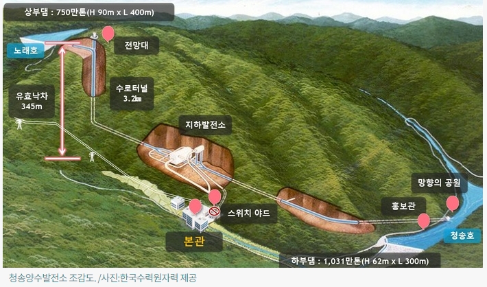 양수발전소는 상․하부 댐으로 구성되며 특정 시간대에 남는 잉여전력으로 하부 댐의 물을 양수하여 상부 댐에 저장한 후 전력공급이 부족하거나 정전 등 비상상황에 전력을 공급하는 친환경'에너지 저장고'로써 원자력 및 재생에너지의 단점을 보완하는 필수 공존 설비로 급부상하는 발전원이다.