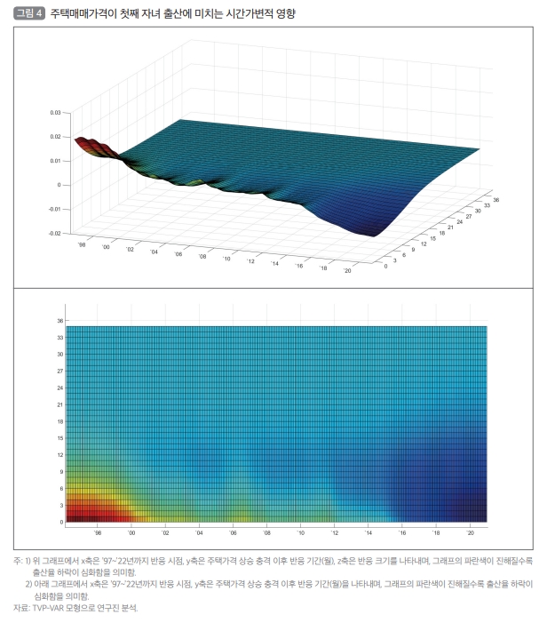 특히, 2020년 전후 주택가격 상승 시기 주택가격 상승 충격은 첫째와 둘째 자녀 출산율에 대해 매우 즉각적이고 강한 하락 영향을 미친 것으로 분석