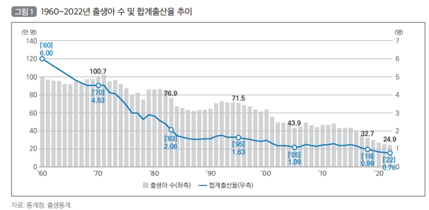 2022년 우리나라 합계출산율은 0.78명으로 전세계에서 가장 낮은 상황으로 출산율 감소에 따른 중장기적인 인구감소, 사회의 지속가능성 훼손 등을 극복하기 위해 저출산의 원인 진단과 극복 방안 마련이 시급한 상황이다.