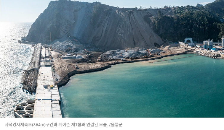 가두봉을 절취, 울릉(사동) 항 동방파제와 케이슨이 설치된 호안 사이를 메우는 공사도 차질없이 진행되고 있다. 지난 2002년 7월에 착공한 이 공정은 오는 2025년 2월에 준공 계획이다,