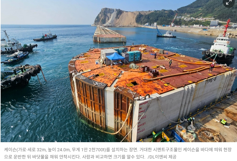 케이슨은 현재 18함 거치로 60%의 공정률을 보이고 있다. DL이앤씨 컨소시엄은 케이슨 공정에는 차질이 없어 계획한 기간 내 마무리될 것이라고 밝혔다.