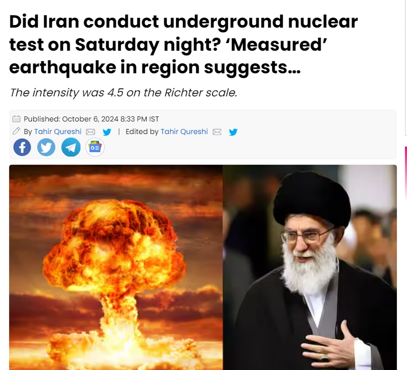 뉴델리: 10월 5일 토요일 밤 이란과 이스라엘에서 중간 강도의 지진이 발생했습니다. 이상하게도 두 나라 모두 지진을 경험한 시점이 약간 달랐습니다. 이런 상황에서 이란이 핵실험을 했을지 추측이 나오고 있습니다.