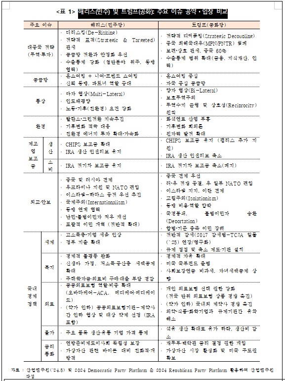 산업연구원은 예측 가능성 측면에서 조 바이든 정부를 이어받는 해리스 부통령이 당선되는 것이 한국에 유리한 점은 사실이지만 누가 되더라도 우리나라 산업에 기회와 위협이 모두 존재한다고 분석했다.